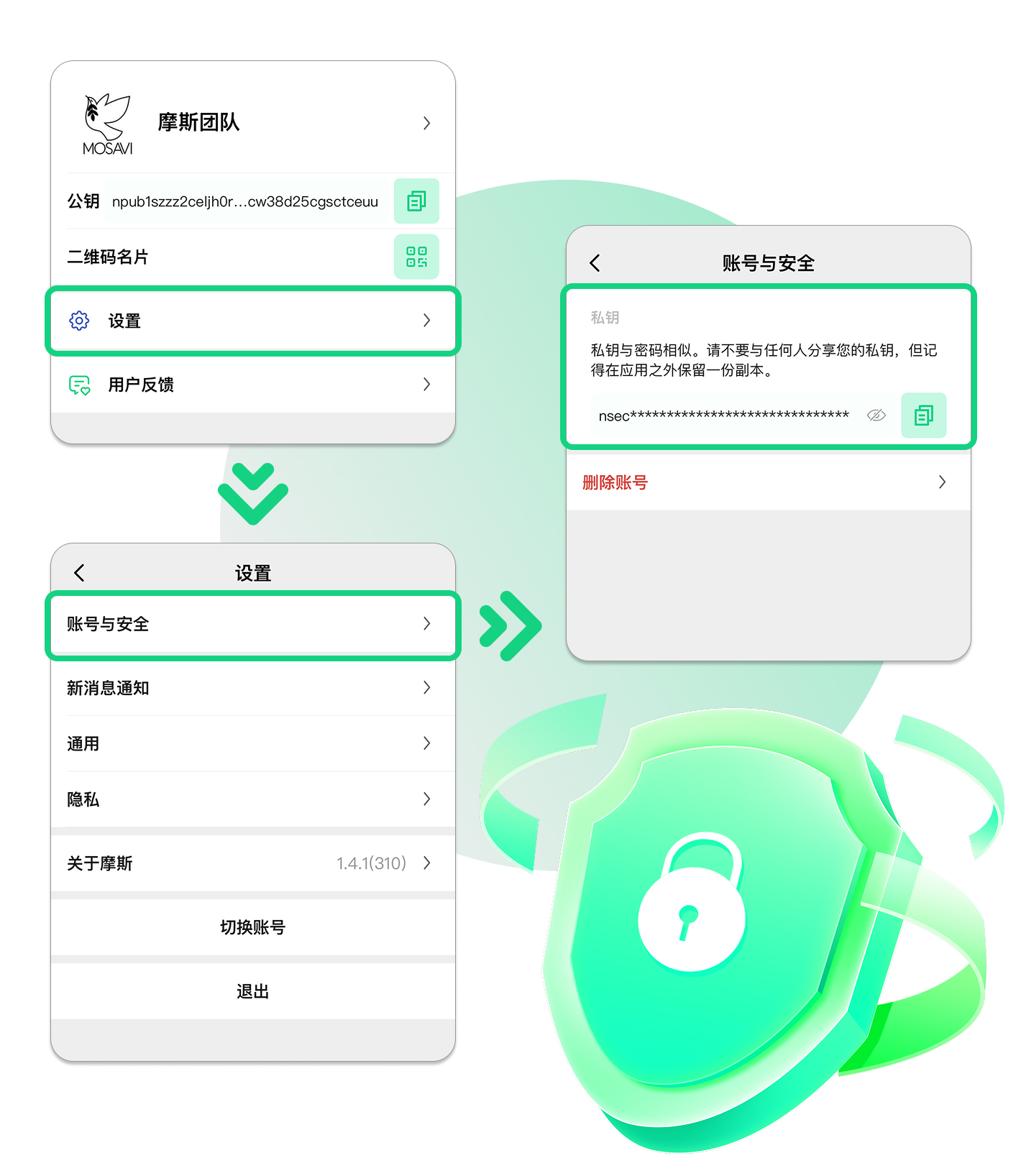 私钥是您账户的唯一凭证,只有持有私钥的人才能访问您的账户。为了保护您的账户安全,请务必妥善保管您的私钥,您可以使用密码管理工具或其他安全方式进行存储。私钥一旦丢失,将无法找回或更改,请务必谨慎保存。 请记住,切勿与任何人分享您的私钥,以确保您的账户安全。 除了注册页面之外,私钥在Mosavi的如下位置中 我-设置-账号与安全-私钥 中。私钥(Nsec)是登录Mosavi账号的唯一凭证,私钥无法修改,无法找回,当您退出您的Mosavi账号时请一定保存好私钥。